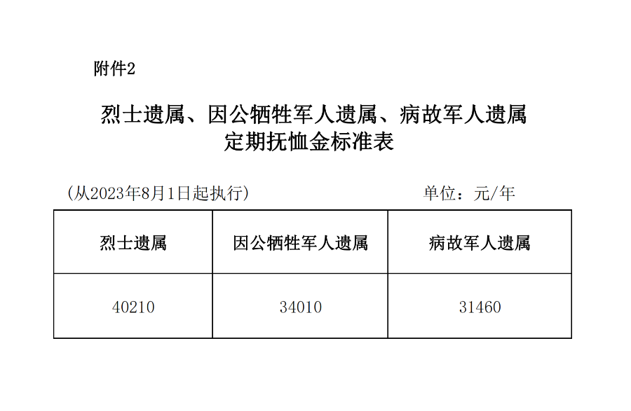 2.烈士遗属、因公牺牲军人遗属、病故军人遗属定期抚恤金标准表