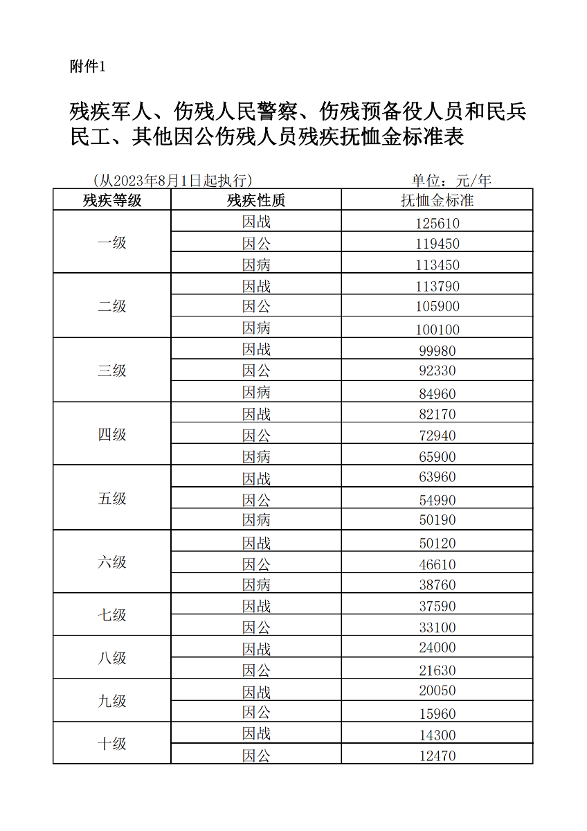 附件:1.残疾军人、伤残人民警察、伤残预备役人员和民兵民工、其他因公伤残人员残疾抚恤金标准表