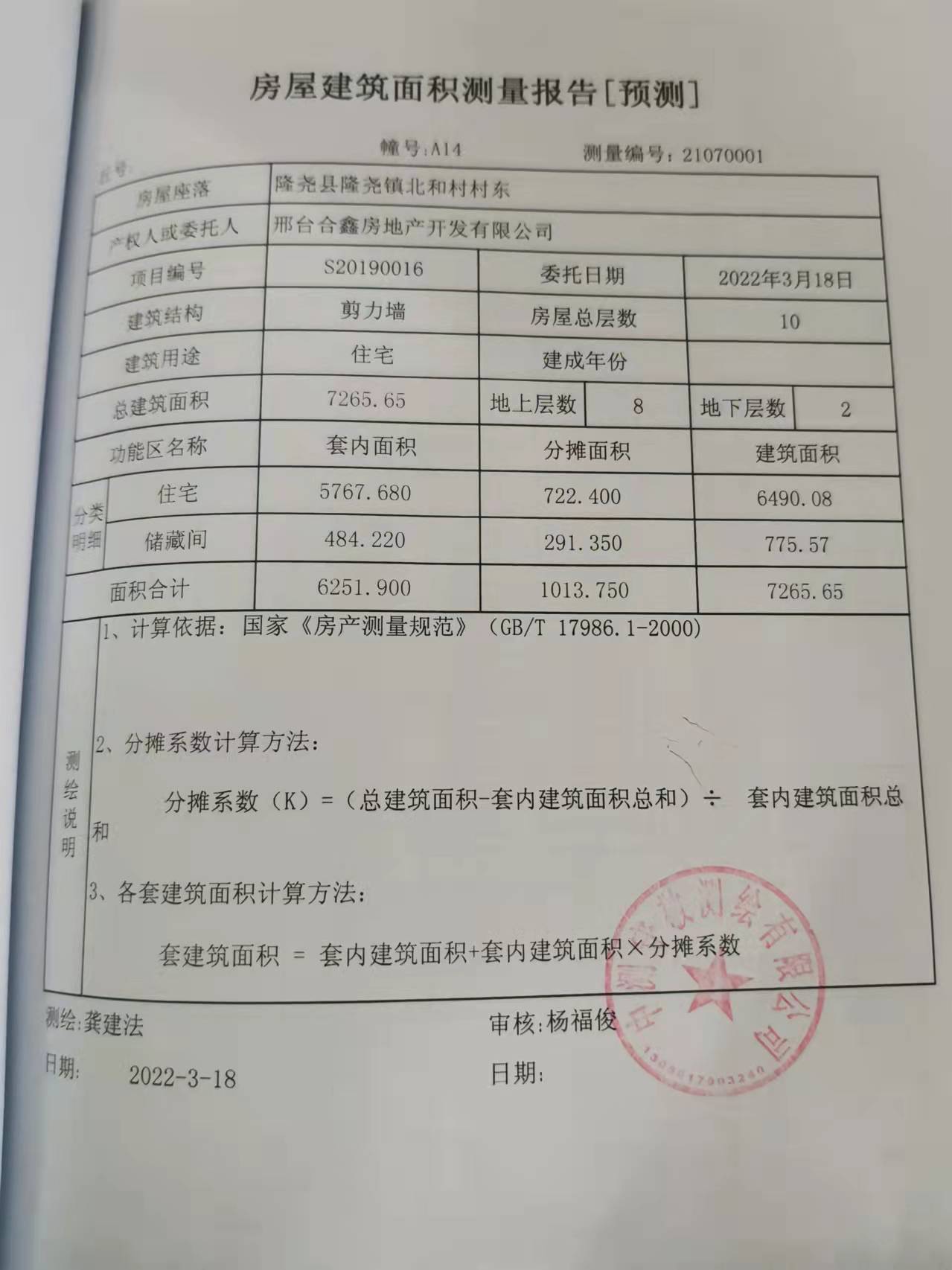 邢台合鑫房地产开发有限公司开发建设的坐落于隆尧县隆平街以西,德兴路以南的北和城中村改造项目一期B区项目,其中A14#住宅楼房屋面积已预测完毕。根据《中华人民共和国城市房地产管理法》、《房产测绘管理办法》、《城市商品房预售管理办法》、《商品房销售管理办法》、《城市房地产抵押管理办法》和《房屋交易与产权管理工作导则》中相关规定明确:预测绘成果中的房产预测绘面积是申请房屋预售、购房合同签约、购房合同备案、在建工程抵押和房产预抵押等房屋交易和产权管理业务的主要依据。现将上述楼栋的房屋位置、房产预测绘面积等信息进行网上公示,请各位业主及相关利害关系人在公示信息内的附件进行查询。如对信息公开平台公示的房产预测绘面积和信息有异议,请于“公示”期内(7日)向隆尧县住房和城乡建设局房产股递交书面意见。