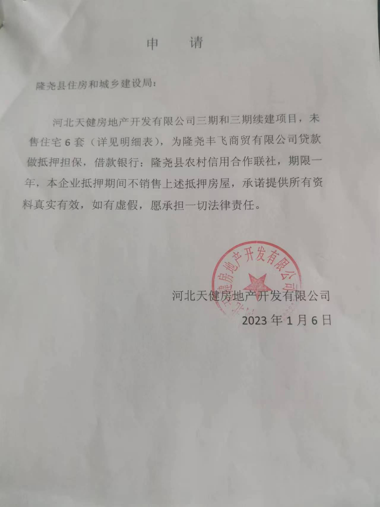 今有河北天健房地产开发有限公司申请,用本公司名下位于滏阳街东侧,金隆路北侧的盛世公馆三期项目未售的6套住宅(详见明细表),为隆尧丰飞商贸有限公司贷款做抵押担保,借款银行:隆尧县农村信用合作联社,期限一年,如已购买以上房产或有异议在7日内向隆尧县住房和城乡建设局反映,逾期或有异议但不成立的,我局将依法为其办理抵押合同网签备案手续。