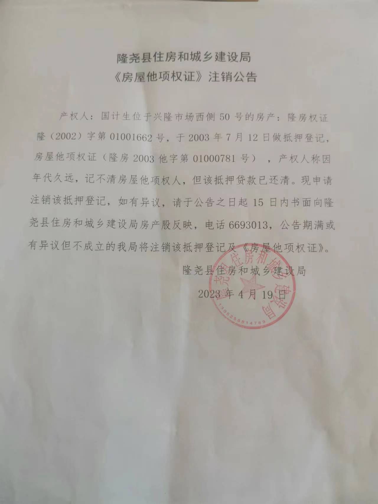 产权人:国计生位于兴隆市场西侧50号的房产:隆房权证隆(2002)字第01001662号,于2003年7月12日做抵押登记,房屋他项权证(隆房2003他字第01000781号) ,产权人称因年代久远,记不清房屋他项权人,但该抵押贷款已还清。现申请注销该抵押登记,如有异议,请于公告之日起15日内书面向隆尧县住房和城乡建设局房产股反映,电话6693013,公告期满或有异议但不成立的我局将注销该抵押登记及《房屋他项权证》。