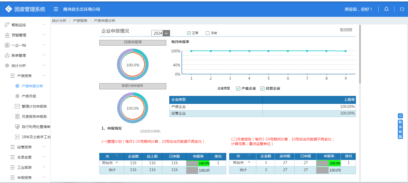 2024年1月至今在河北省固体废物动态信息平台管理计划申报率及月度申报率均为100%。