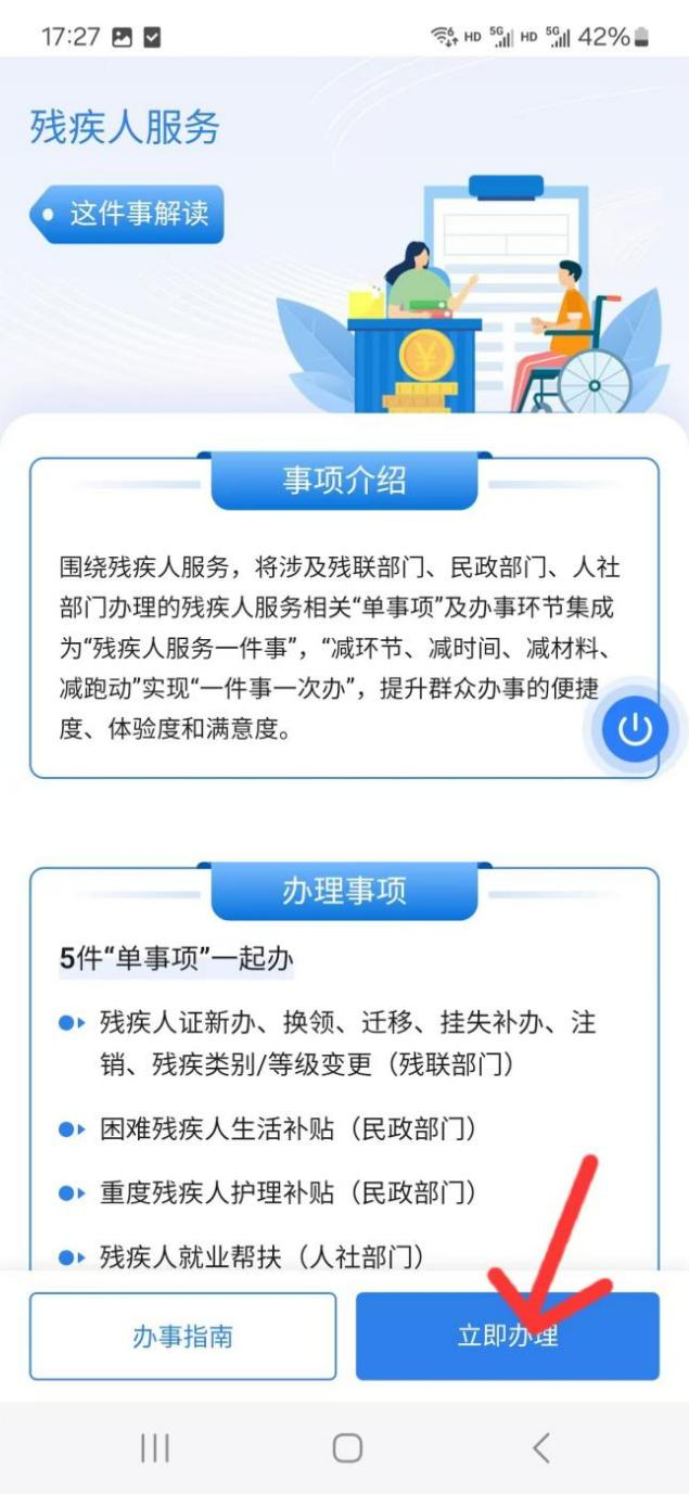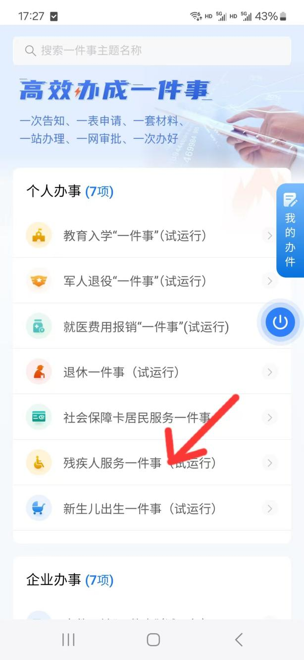 步骤二 | 点击首页下方“高效办成一件事专区”,然后选择“残疾人服务一件事(试运行)” |
