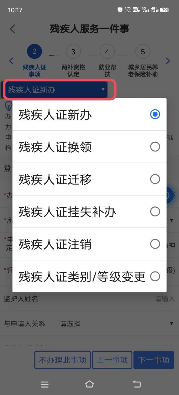 步骤五 | 点击“残疾人证新办”项的下拉清单可以根据需求选择需要办理的事项 |