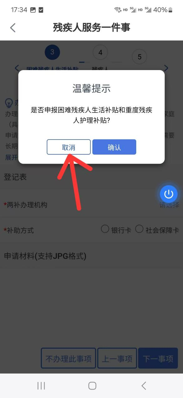 步骤七 | 不需要办理“两补资格认定”、“就业帮扶”、“城乡居民养老保险补助”,在温馨提示弹窗选择“取消”,或点击左下角“不办理此项” |