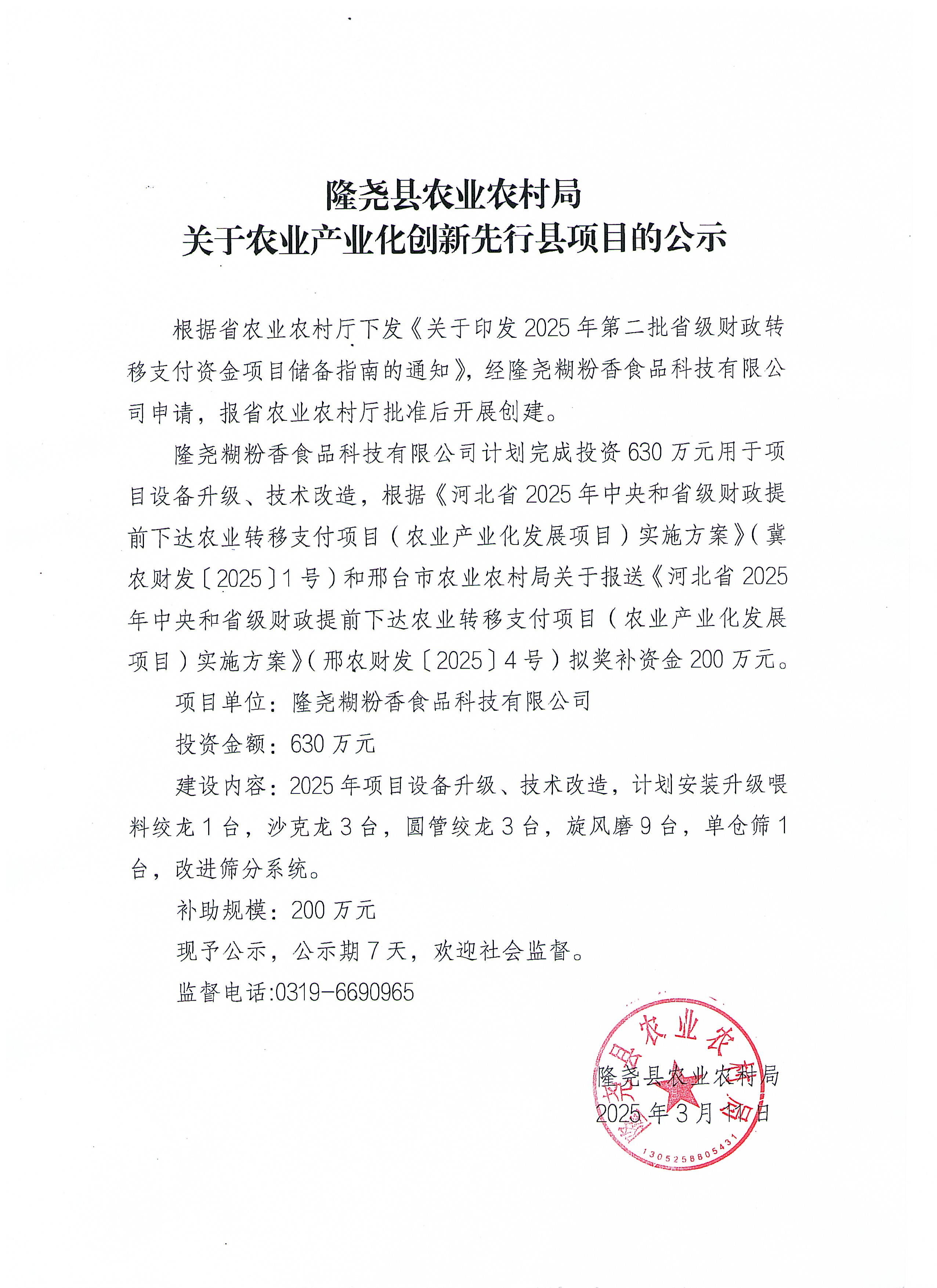 隆尧糊粉香食品科技有限公司计划完成投资630万元用于项目设备升级、技术改造,根据《河北省2025年中央和省级财政提前下达农业转移支付项目(农业产业化发展项目)实施方案》(冀农财发〔2025〕1号)和邢台市农业农村局关于报送《河北省2025年中央和省级财政提前下达农业转移支付项目(农业产业化发展项目)实施方案》(邢农财发〔2025〕4号)拟奖补资金200万元。