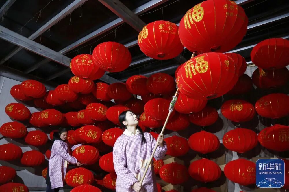 12月27日,邢台市南和区东三召乡一家灯笼作坊工人在晾晒灯笼。