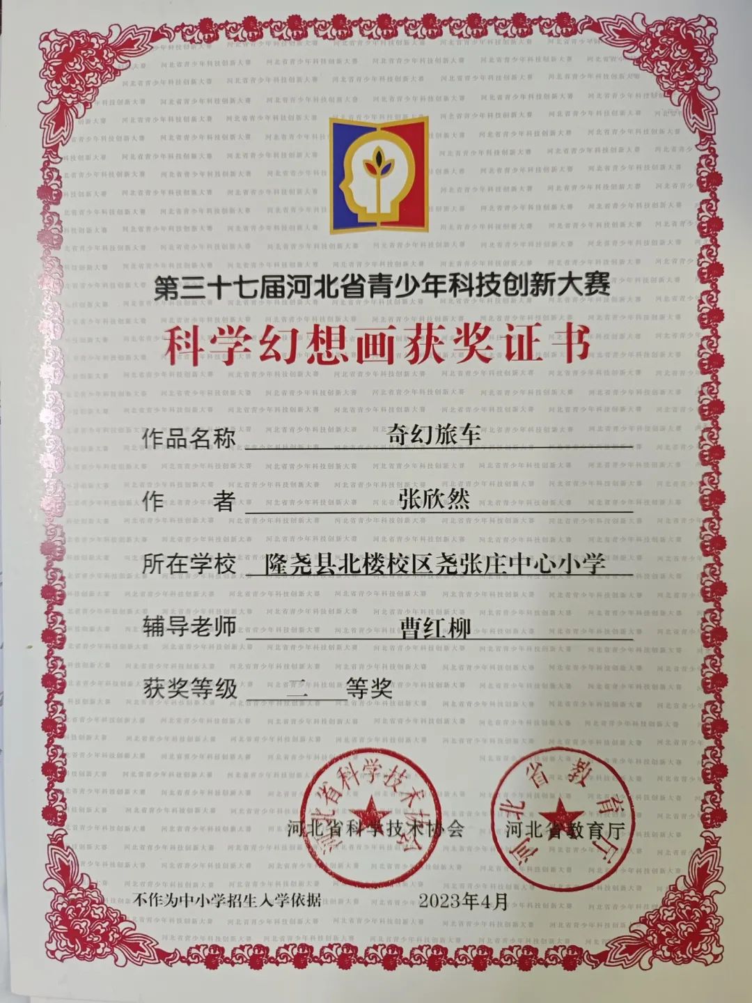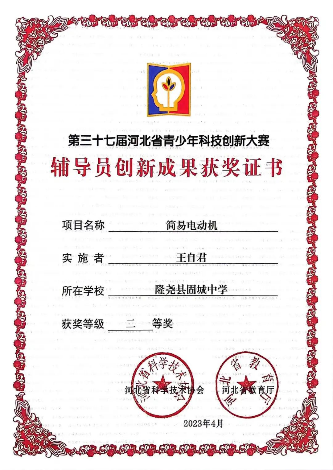 近日,隆尧县青少年校外活动中心收到由河北省科技协会主办、河北省教育厅协办的第三十七届河北省青少年科技创新大赛组委会寄来的获奖证书,我县固城中学教师王自君自制教具《简易电动机》获得辅导员创新成果二等奖;北楼校区尧张庄中心小学学生侯佳慧、张欣然绘画作品获得科幻画二等奖。