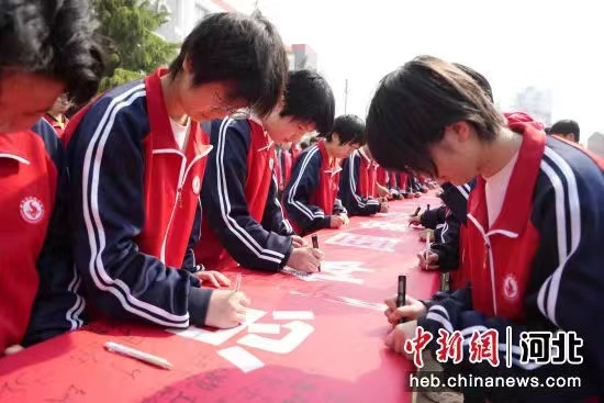 图为河北省隆尧县实验中学“维护国家安全从我做起”主题签名活动现场,学生在条幅上签名。张玲玲摄