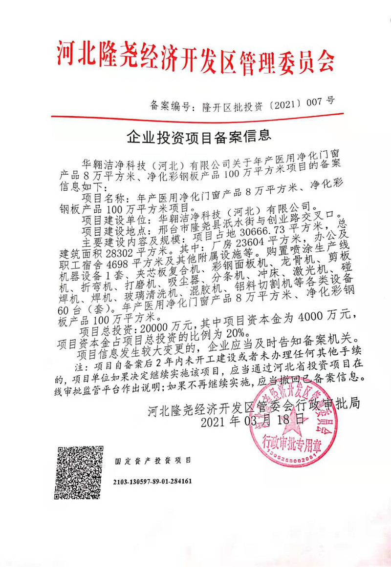 (华翱洁净科技(河北)有限公司年产医用净化门窗产品8万平方米、净化彩钢板产品100万平方米项目)