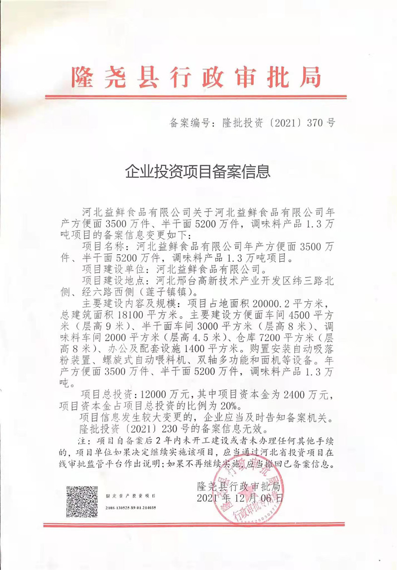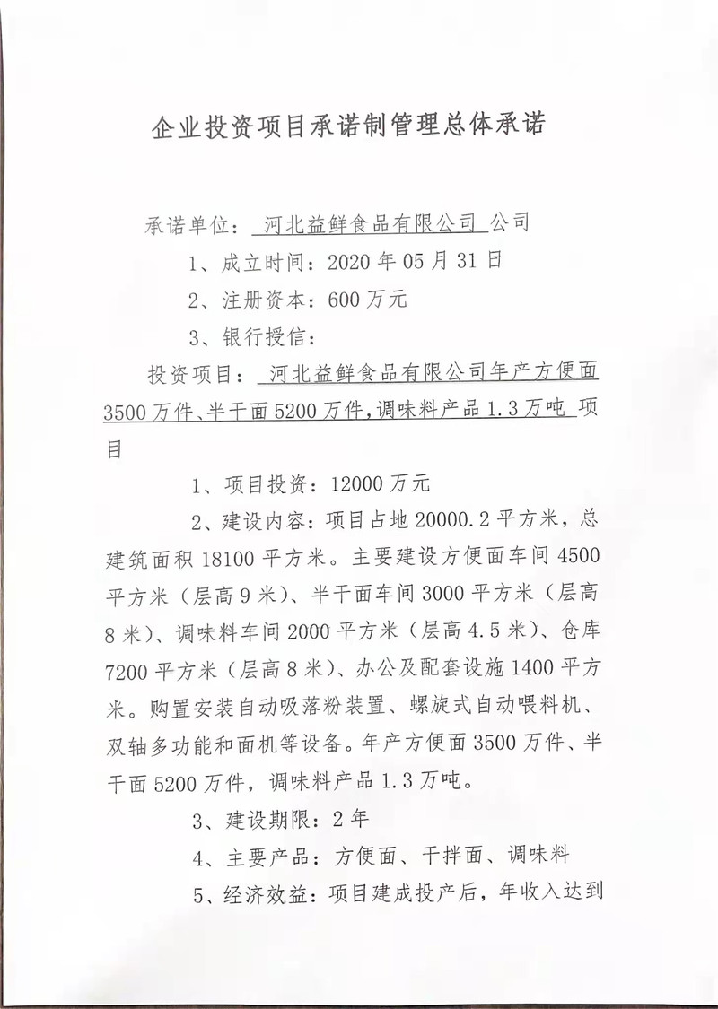 河北益鲜食品有限公司年产方便面3500万件、半干面5200万件,调味料产品1.3万吨项目,经县企业投资项目承诺制改革办公室审核,并征求有关部门意见,县承诺制领导小组批准纳入“承诺制”管理程序。2021年12月10日,企业自愿签署的企业投资项目承诺制管理承诺书,现对该项目的承诺书及项目备案信息予以公示,公示时间为2021年12月13日至2021年12月15日。如有异议,可自公示之日起三日内,向县企业投资承诺制改革办公室提出意见和建议。
